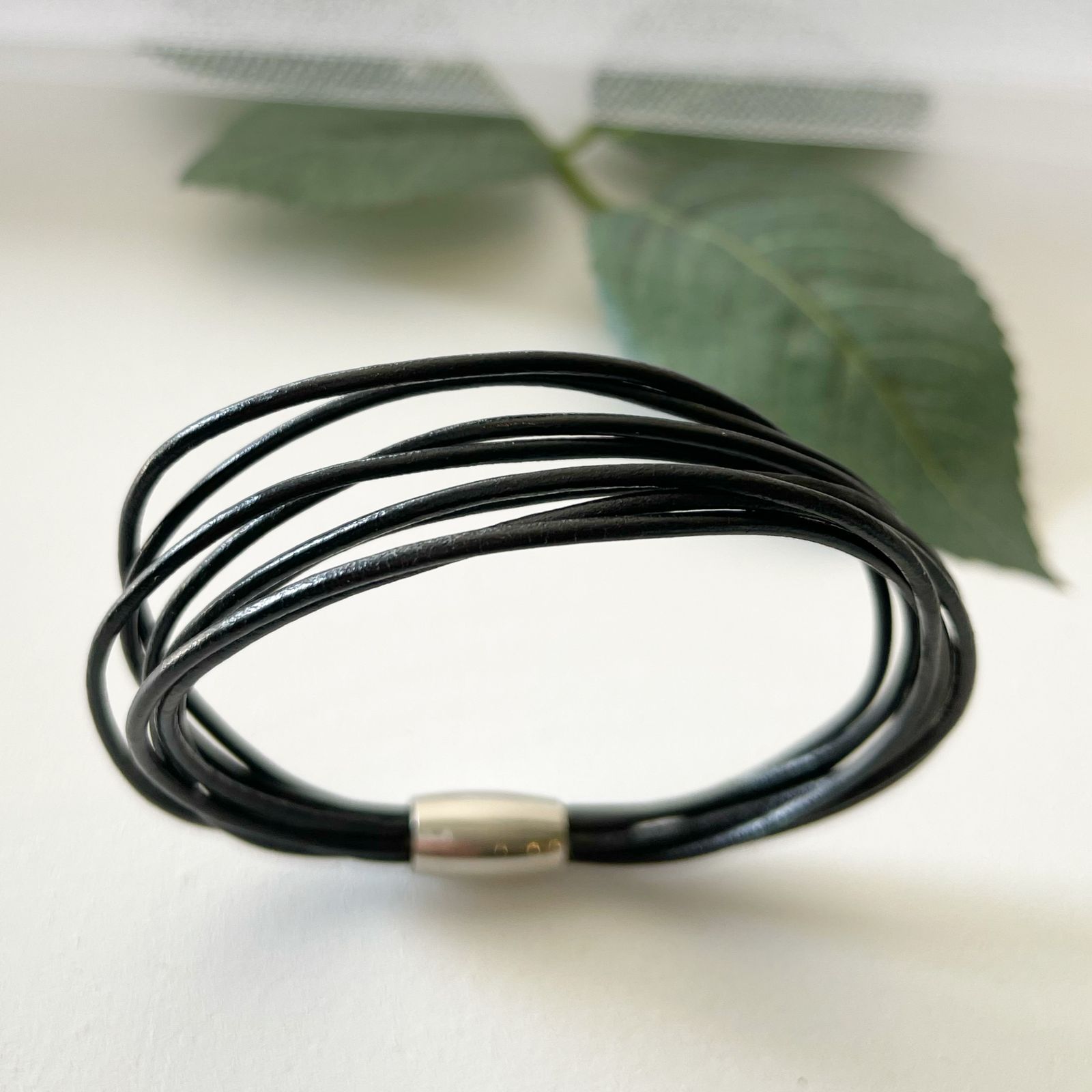 BLACK LEATHER STAINLESS STEEL MAGNETIC CLASP BANGLE