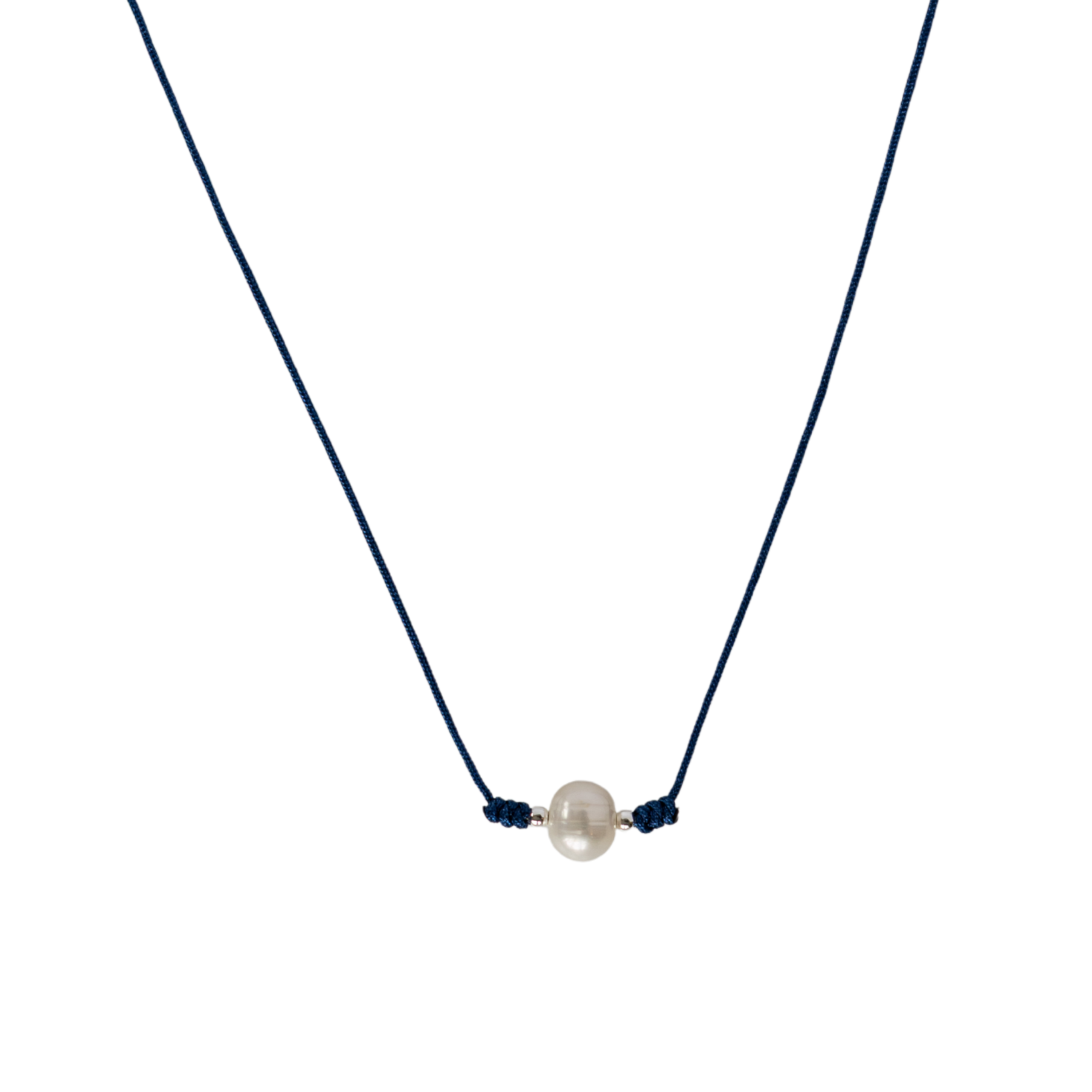 STERLING SILVER FRESHWATER PEARL NAVY BLUE SILK NECKLACE