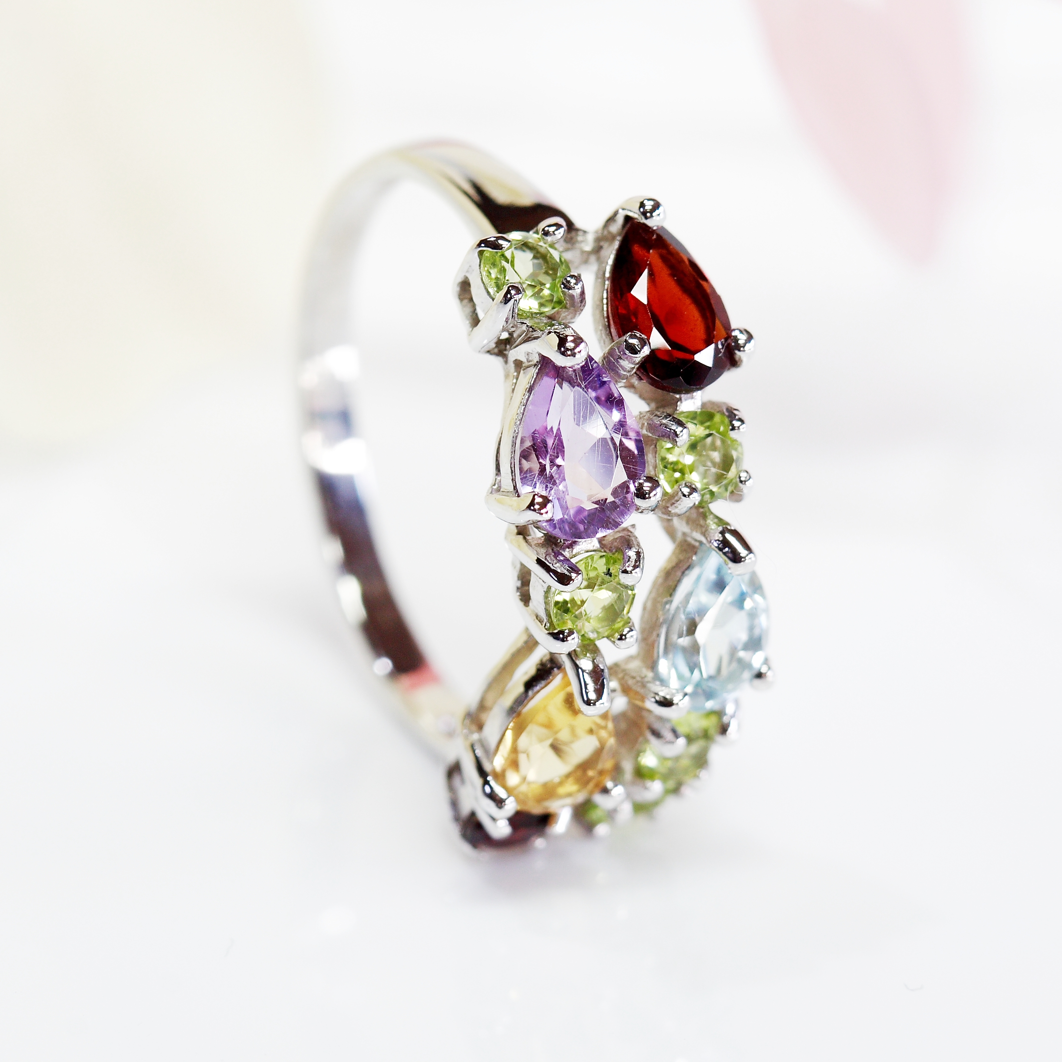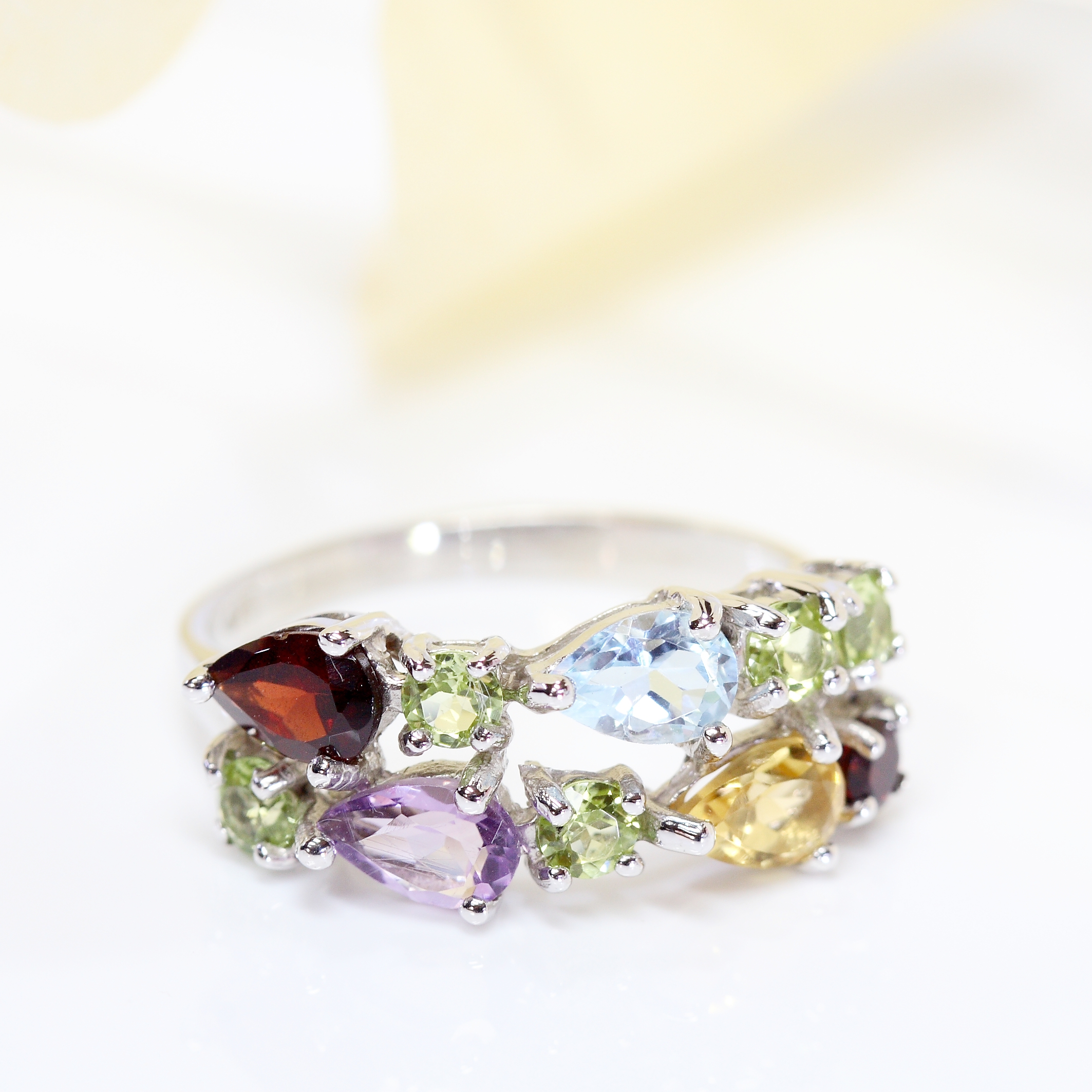 STERLING SILVER DOUBLE ROW MULTIPLE GEMSTONE RING