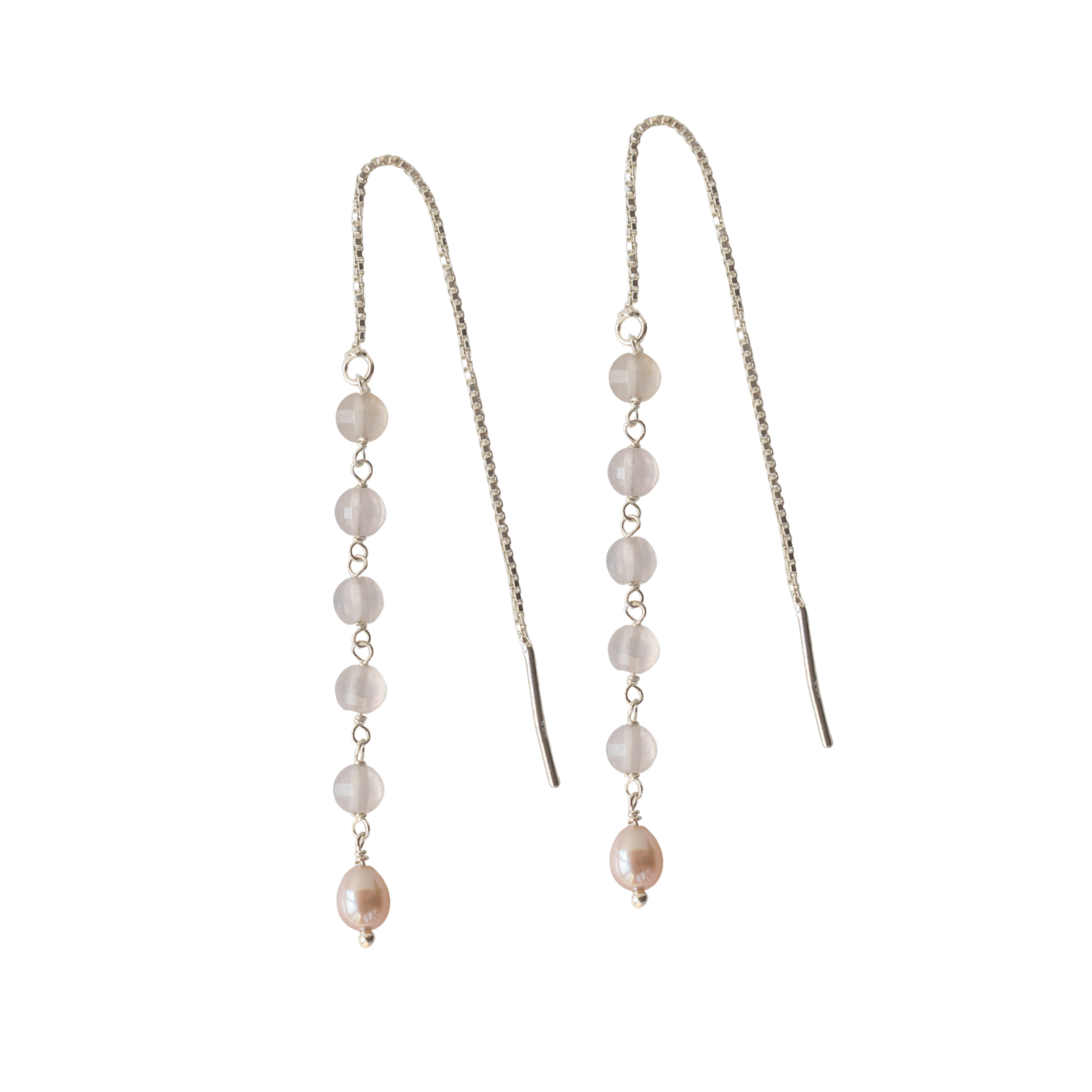 STERLING SILVER, THREAD THROUGH PEARL AND ROSE QUARTZ EARRINGS