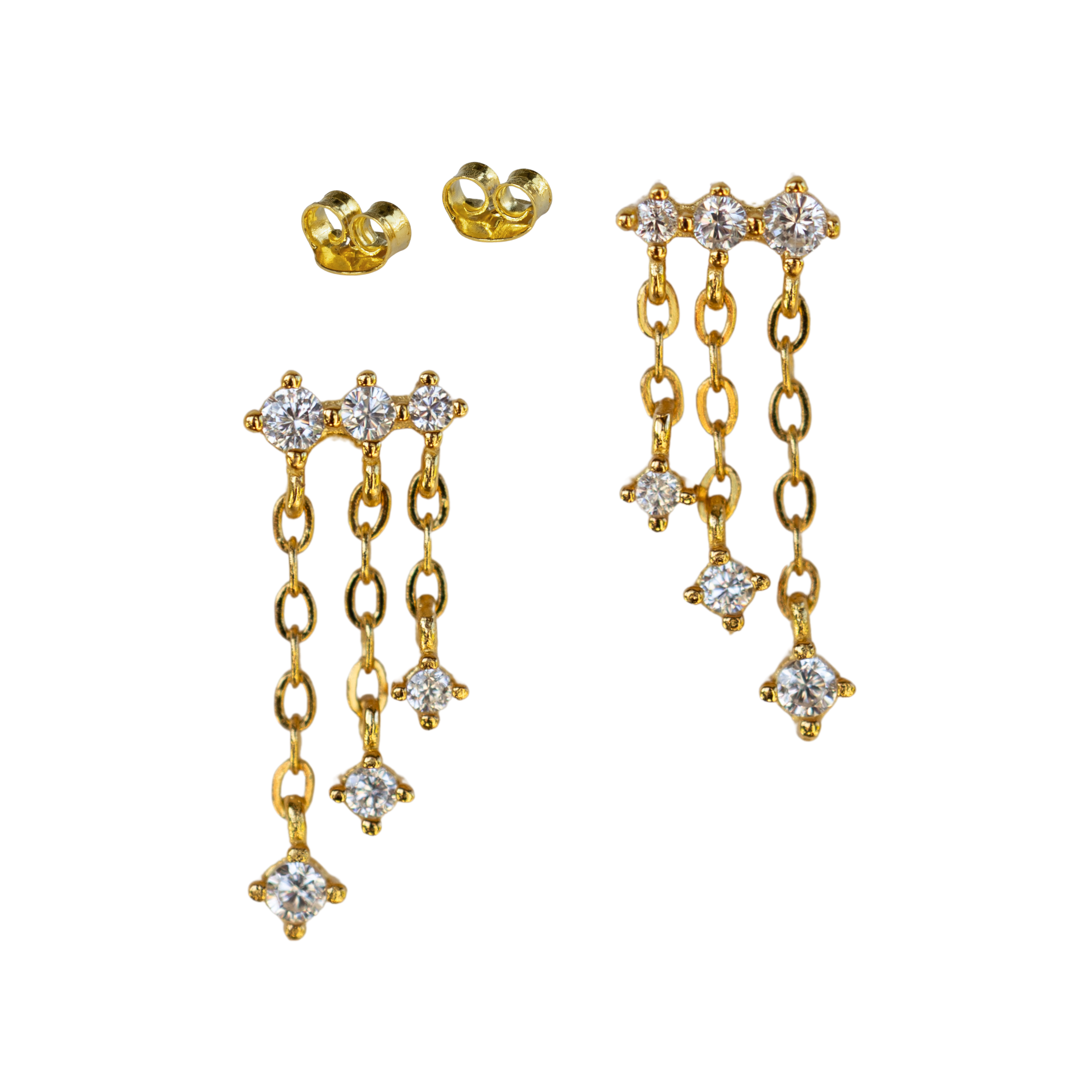 STERLING SILVER GOLD PLATED DANGLING CHAIN CUBIC ZIRCONIA STUD EARRINGS